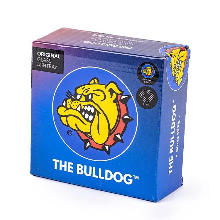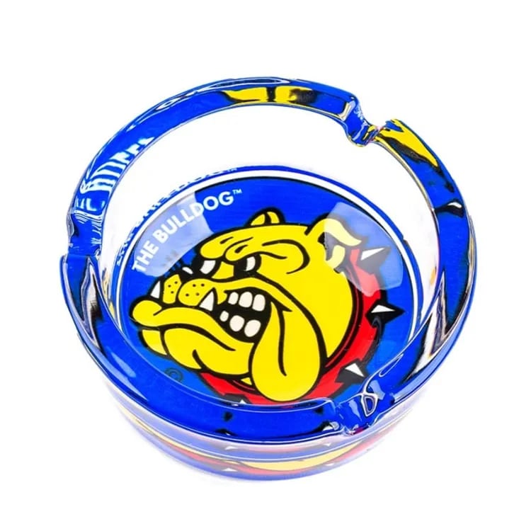 Bulldogガラスアッシュトレイの底部にはフルカラーのロゴが付いています。灰皿は直径10cmで、お手入れが簡単な高品質のガラスで作られてて、灰皿自体はどんなテーブルにも似合います。